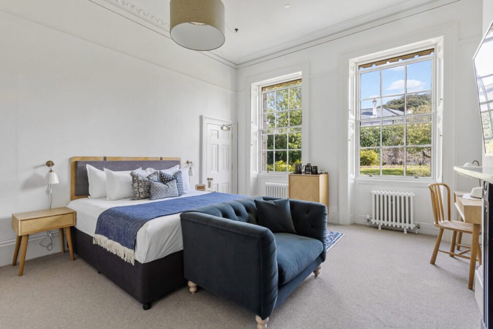 The structure was originally built around 1830 to the plans of Sir John Rennie to serve as accommodation for the Royal Navy’s officer classes. Bistrot Pierre extensively and sympathetically restored the Georgian building, removing 20th-century modernisation to reinstate its original features like sash windows and period charm. The design by Gillespie Yunnie Architects pairs this classic architecture with modern, luxurious interior amenities to create stylish boutique rooms.